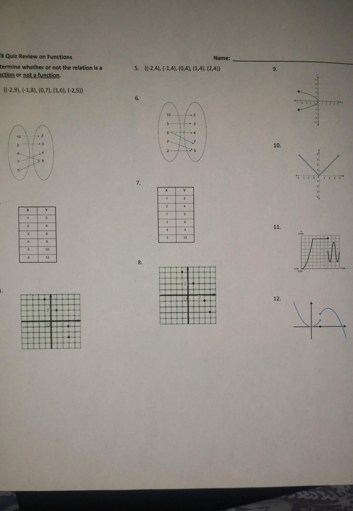 9. not a function because the same input goes to 2 different outputs. A function input cannot have 2 outputs. It also did not pass the vertical line test.