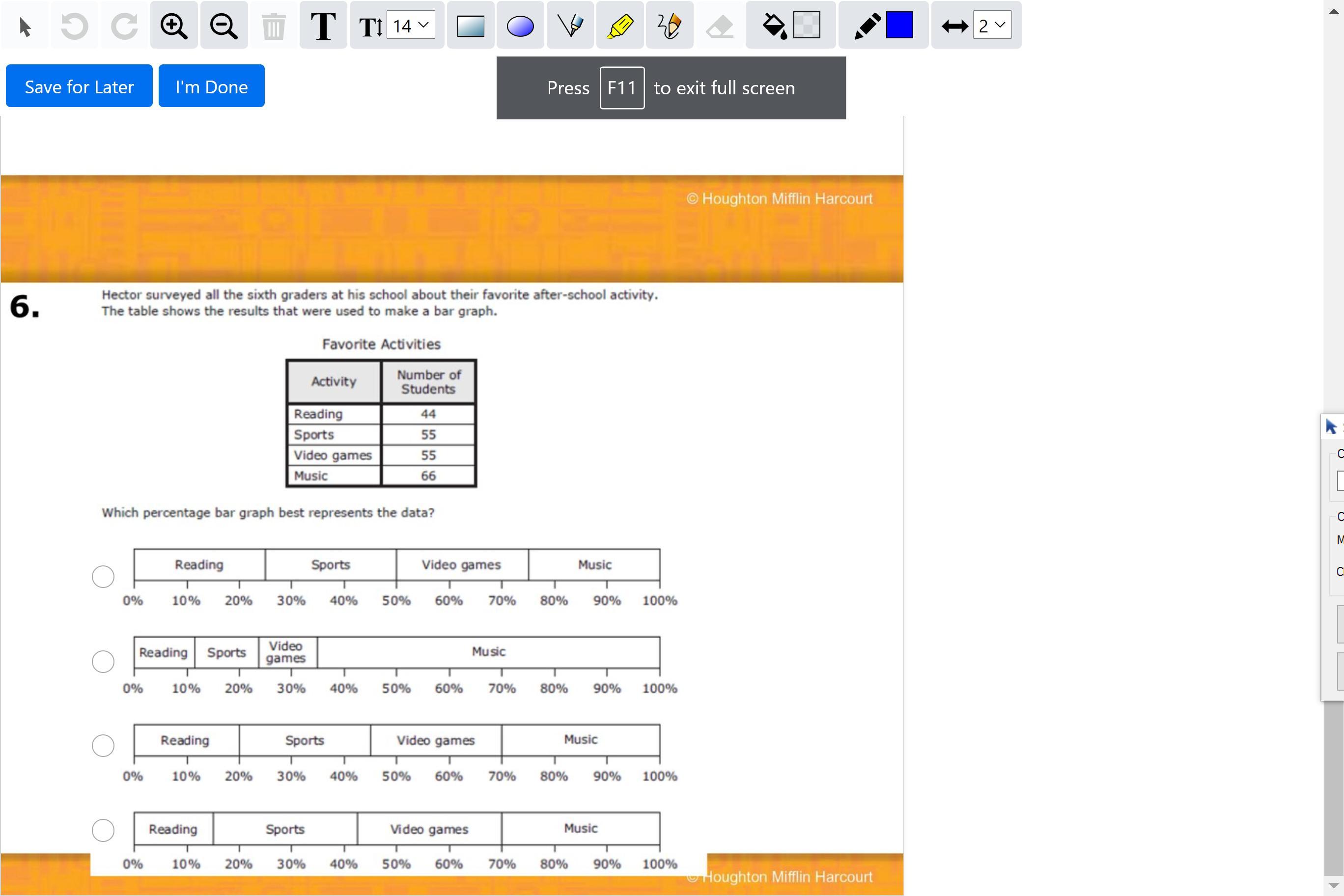 The total amount of students would be exactly - 220 students. So that means reading would be exactly 20% of the students, as of 40/220 = 0.2 = 20%. That means automaticially the third choice would be correct, but let's do more calculations to make sure- 55/220 = 25%, 66/220 = 30%. That means that our answer is in fact correct.