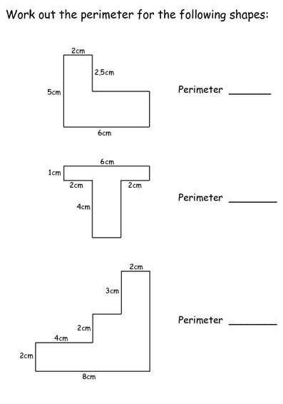 For instance, the perimeter for problem 1 is 5+2+2.5+4+2.5+6 = 22 cm. Problems 2 and 3 are handled the same way.
