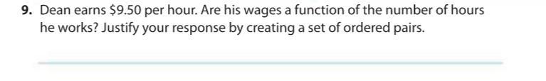 The two ordered pairs found so far were (1,9.50) and (2,19). Note how each x input leads to exactly one y output. It's not possible for Dean to work some number of hours and earn two different paycheck amounts. This means we do have a function here.
