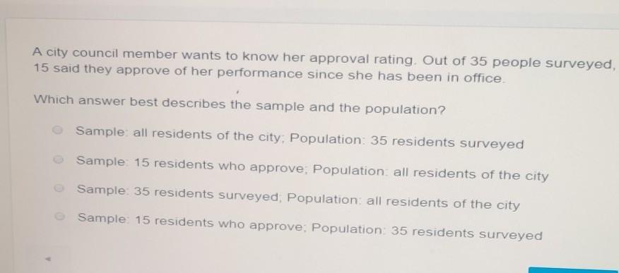 So, in this case, we are talking about a survey, that means the population are wall the residents of the city, that's the major set of subjects. And the sample is all 35 people that were surveyed, the represents a sub-set of the population.