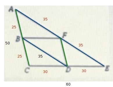 in this case, the green DF || AC, and since AC is 50, DF is half that, 50/2.