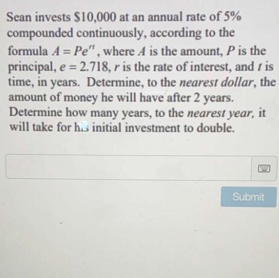A = 11,051.71 Easy. Now onto the second part: solving for the number of years it takes for the investment to double. Setting A equal to 20,000 since 20,000 is 10,000 doubled: