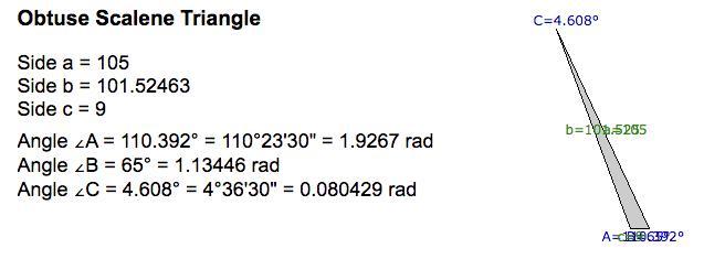 b^2 = 105^2 +9^2 -2·105·9·cos(65°) ≈ 10307.251