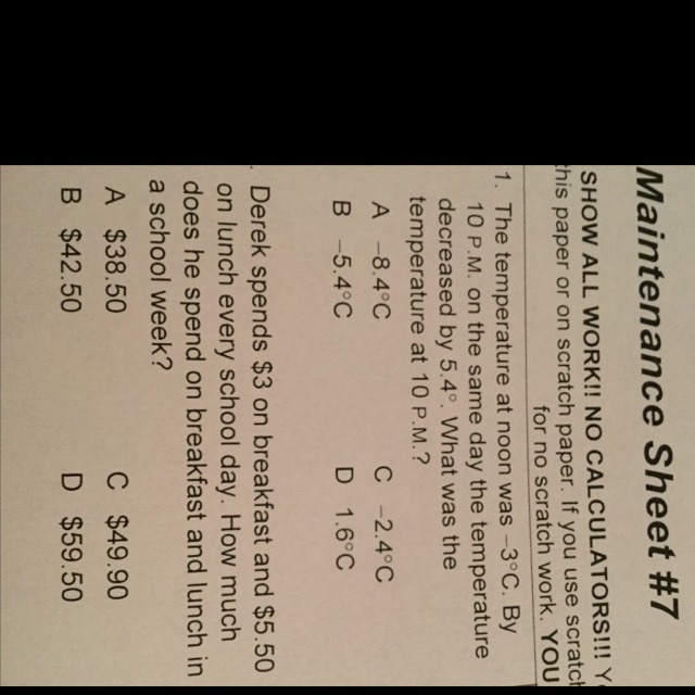 For the first one, you take the original temprature -3.0° and add -5.4° which gives you an answer of -8.4°c :)