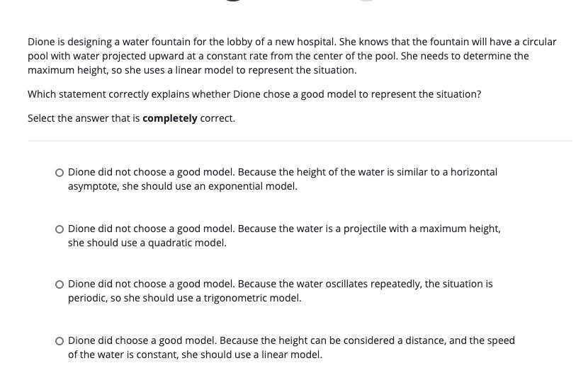 Diane did not choose a good model. Because the water is a projectile with a maximum height, she should use a quadratic model