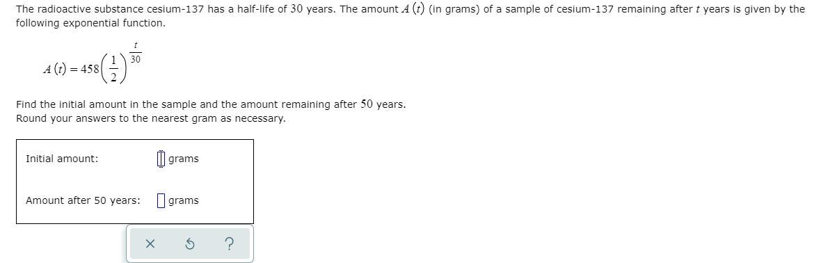 - A(50) = 458*(1/2)^(50/30) = 144 g (rounded)
