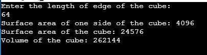 edge = int(input("Enter the length of edge of the cube:\n"))#defining edge variable that input value