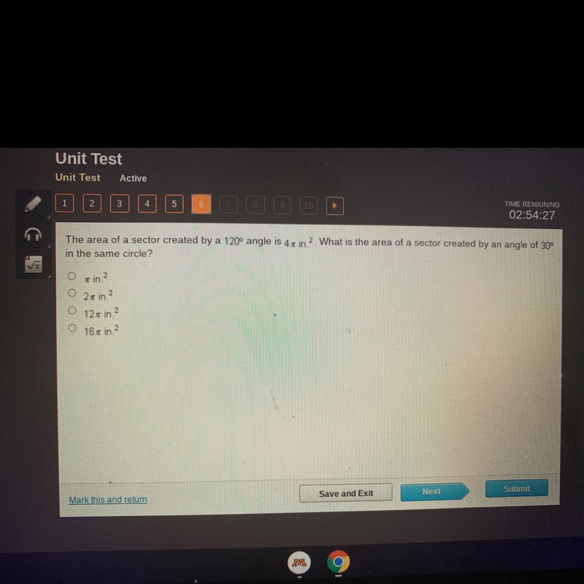Therefore, the area of the sector created by 30 ° us π in².