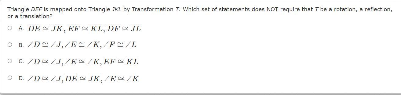 1. Any mapping requiring segment lengths to be congruent will require a "rigid" transformation, some combination of rotation, reflection, and translation.