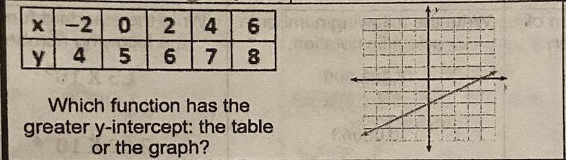 The table has a higher y-intercept. The graph shows a y-intercept of -2, because the line is crossing over that point on the y-axis. The table shows that when x is 0, the y intercept is 5. Meaning the tables y-intercept is higher.