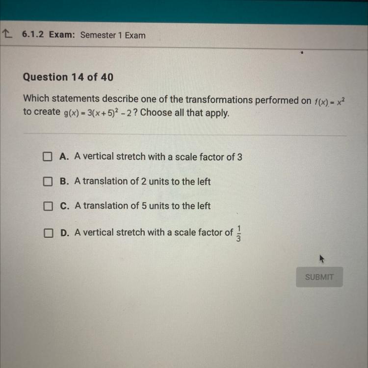 It means the graph of f(x) is vertically stretched with a scale factor of 3, shifts 5 units left and 2 units down to get g(x).