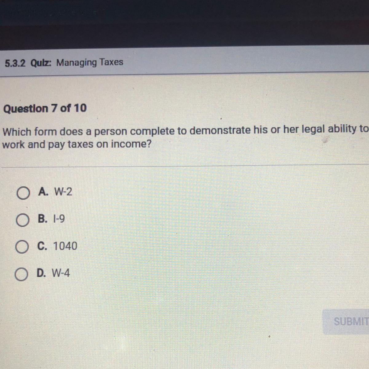 Which form does a person complete to demonstrate his or her legal ability to work and pay taxes on income?