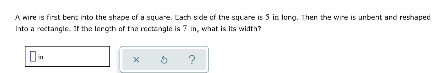 If the wire is in a square and all the sides are 5 inches when you unfold the wire it will be 20 inches long so if the length of the wire ina regtangle is 7 then the width is 3