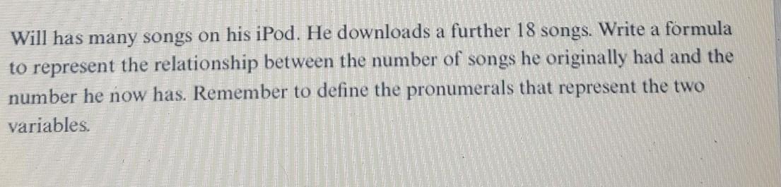 Since Will downloaded 18 more songs, we add 18 to the original amount of songs he had (x). The total will be how many songs he has now (y).