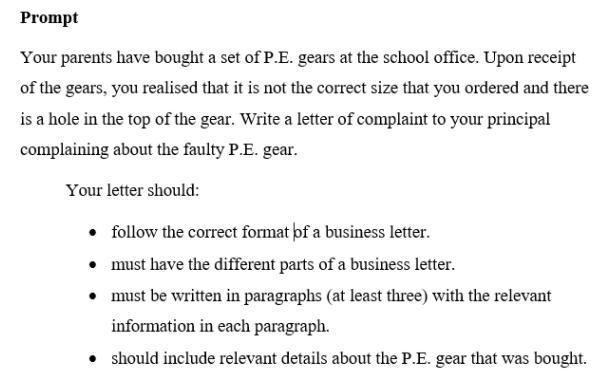 Dear Principle, My parents have bought P.E from the school office. Unfortunetlly, it is not the correct size that we requested, there is lots of damage to the equipment also, making the gear unusable and futile.