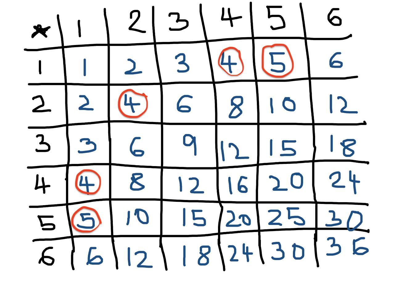 P = ways to get 4 or 5 as a product/ all possible ways = 5/36