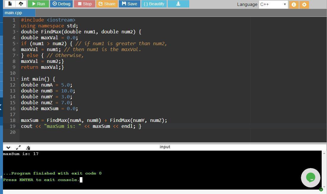 maxSum = FindMax(numA, numB) + FindMax(numY, numZ);