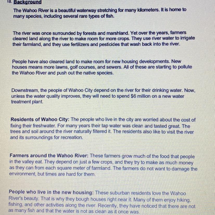 1. Moving the facilities such as crops, lawns, golf courses, and sewers etc would be unrealistic to change because many of the owners would not comprise (costs so much already), yet there are solutions. For example, the town can restrict farmers from poluting the rivers with pesticides as well as fining them and the house developments golf courses and land owners in which the money can be used towards the filteration cost. Another idea would to build cheaper wells to soak up water from different river locations or build barriers around settlements from the river. Another idea would to simply grow natural filters such as using the trees and soil they already had.