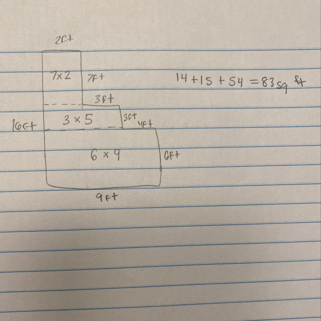 Break the shape into smaller rectangles and solve for there areas. Then add the areas together to get the total area of the figure. See the picture below where I solved the problem