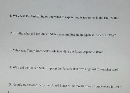 Answer: 1. The frontier in the United States had been settled and Americans needed other areas in which to expand. The ideas of Anglo Saxonism also influenced Americans for the need to expand.