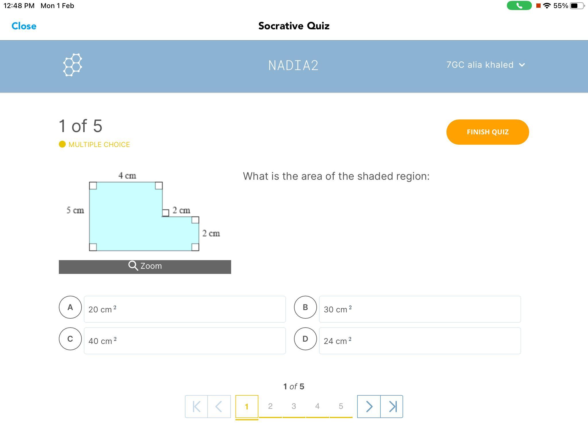 The area of the shaded region is 24 square centimeters. (Answer: D)
