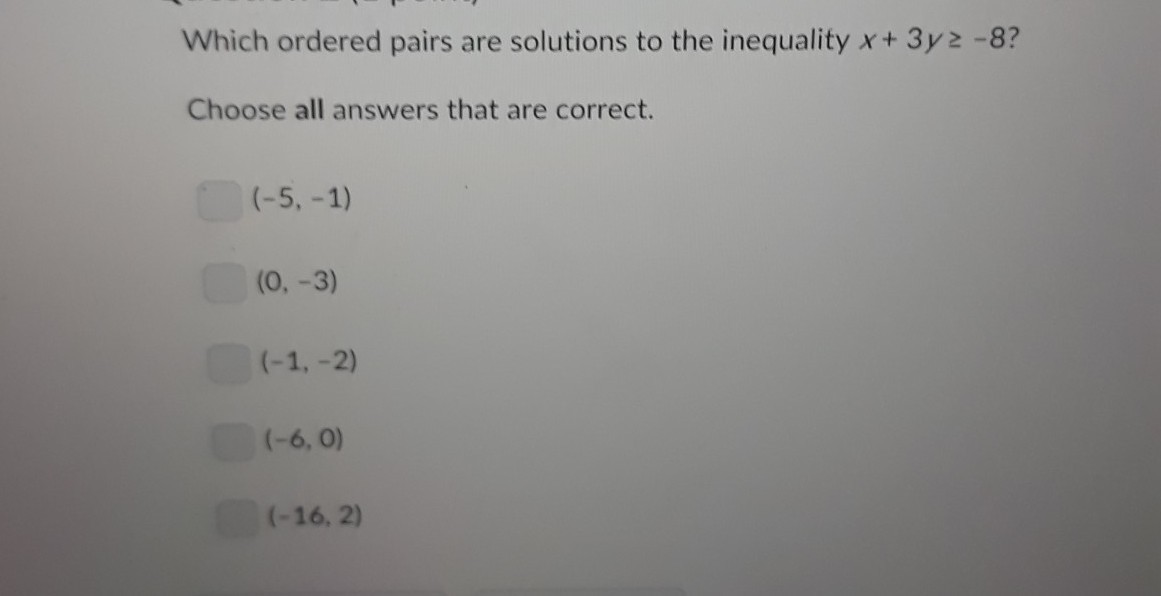x + 3y ≥ -8 ⇒ (-5)+ 3(-1) ≥ -8 ⇒ (-5) - 3 ≥ -8 ⇒ -9 ≥ -8 (not true) as -8 ≥ -9