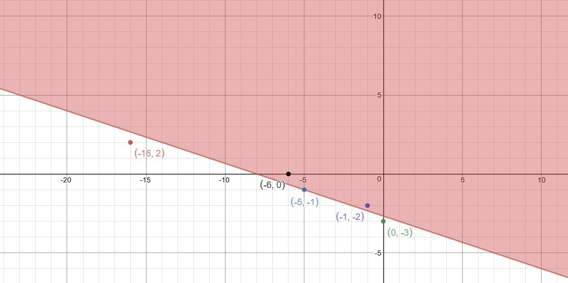 x + 3y ≥ -8 ⇒ (-6)+ 3(0) ≥ -8 ⇒ (-6) ≥ -8 (true)