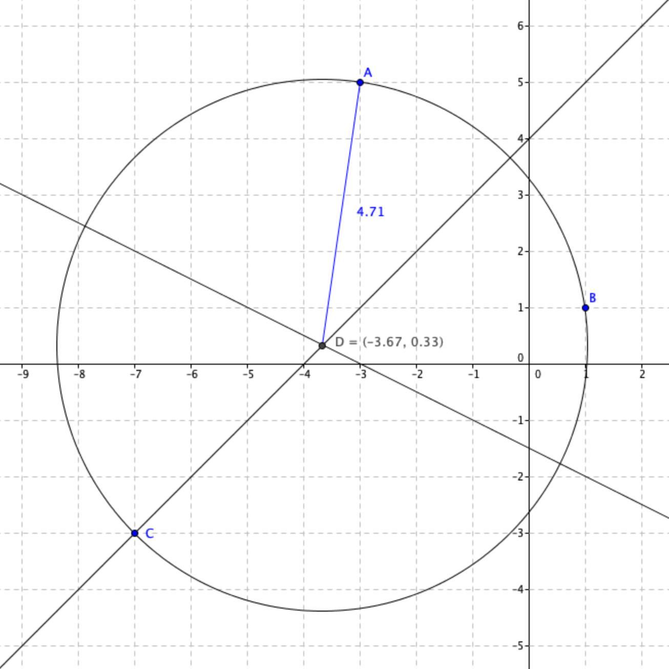 The point of intersection of the right bisectors is (x, y) = (-3 2/3, 1/3).
