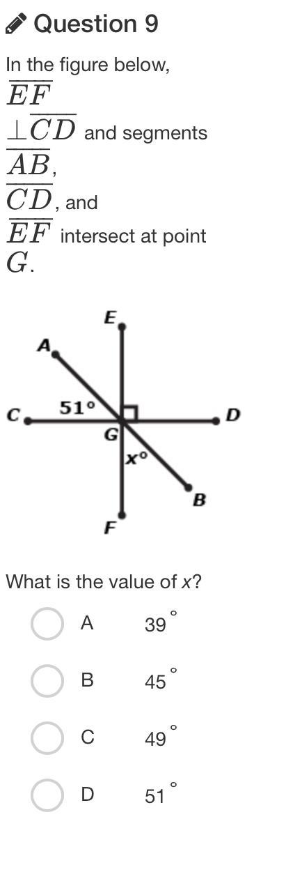 Since 90-51=39, and <AGC = <BGD, x=39 degrees