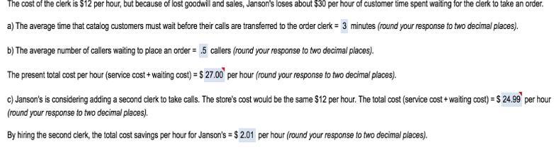The cost of the clerk is 12 per hour, but because of lost goodwill and sales, Janson's loses about 30 per hour of customer time spent waiting for the clerk to take an order.
