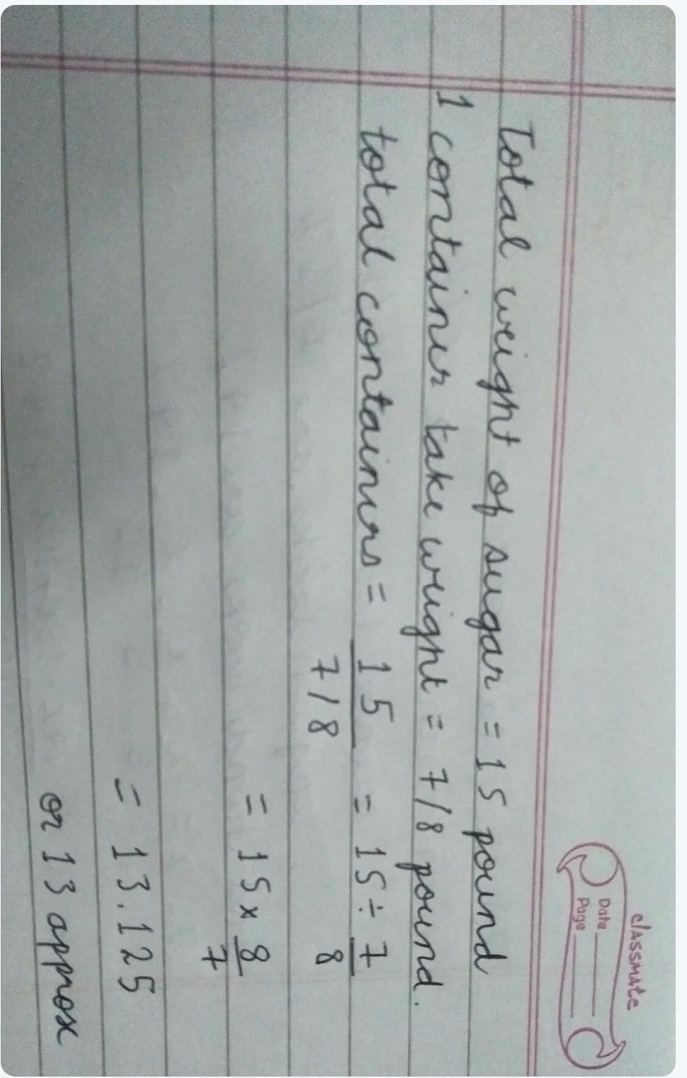 A 15-pound bag of sugar is being split into containers that hold 7/8 of a pound. How many containers of sugar will the 15-pound