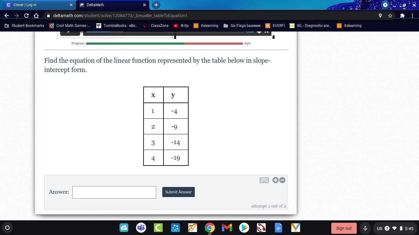 [To find the y-intercept all you have to do is find what y is counting by. In this is would be -5. Go backwards one on the table so x is 0 and take away -5 and it will give you 1 which would be the intercept]