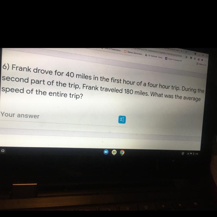 given the originally traveled 40 miles in one hour gives us 40 mph, 180 miles in the last 3 hours gives us an average of 60 mph for the second part, 40+60+60+60 (for the 3 hours going that fast) is equal to 220, divide that by 4 to give us our average of 55 mph