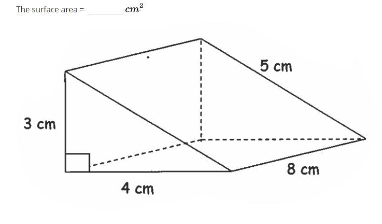 SA = 2 * (3 cm)(4 cm)/2 + (3 cm + 4 cm + 5 cm) * (8 cm)