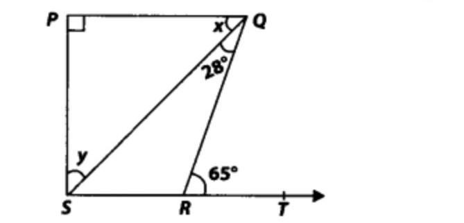 In figure, if PQ ⊥ PS, PQ||SR, ∠SQR = 2S° and ∠QRT = 65°, then find the values of x and y.​