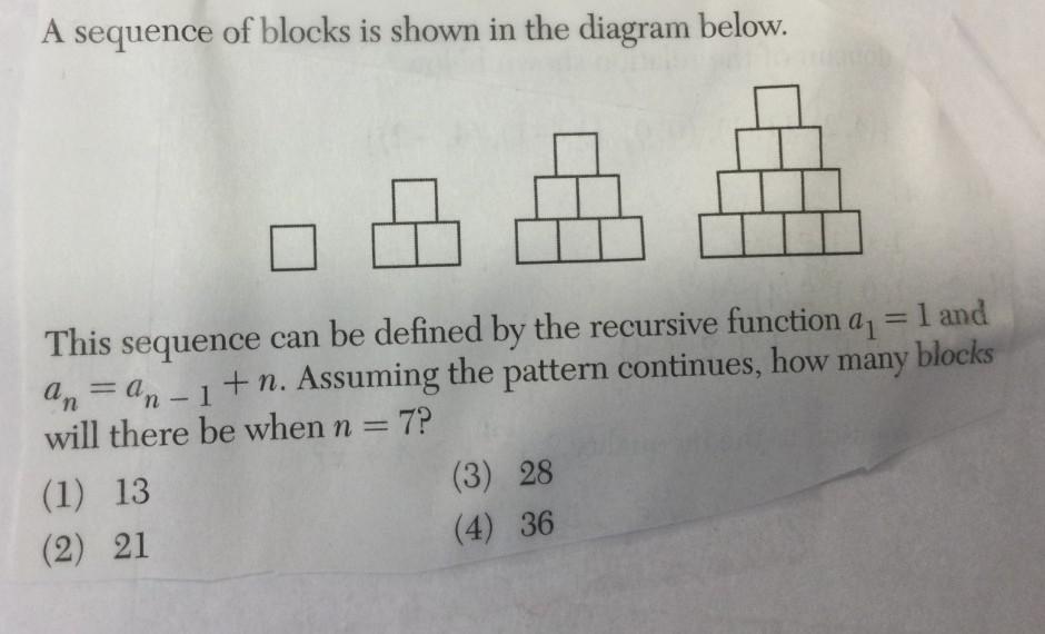 So the 6th figure will have 15+6 = 21 blocks in total while the 7th figure has 21+7 = 28 blocks. This points us to choice (3).