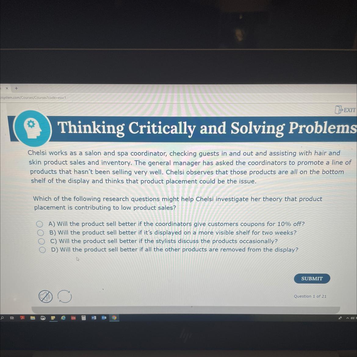 ry the general manager asked the coordinated to promote a line of products that hasn’t been selling very well Chelsea observes that those products are all on the bottom shelf of the display and thinks that product placement could be the issue which of the following research questions might help Chelsea investigate her theory their product placement is contributing to low product sales?