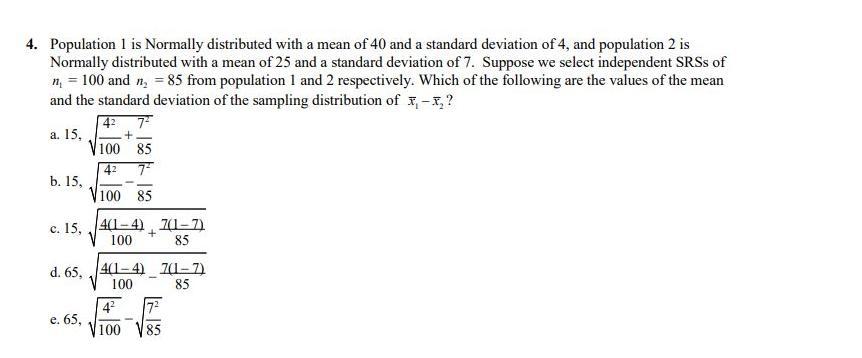 population 1 is normally distributed with a mean of 40 and a standard deviation of 4, and population 2 is normally distributed w
