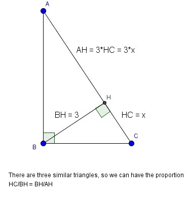 After adding in the altitude BH, we have three similar triangles. So we can form the proportion shown below to solve for x