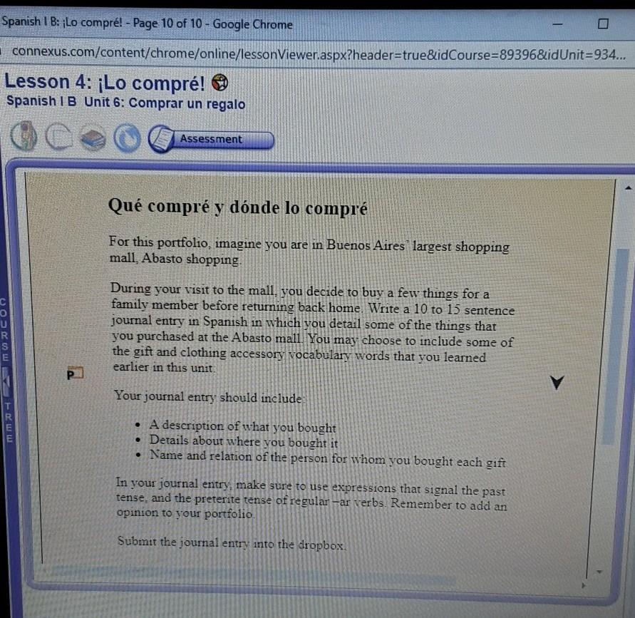 Compré 4 regalos para mi familia en Abasto's. La primera fue una bolsa de lima para mi prima adolescente, Samantha, que compré en una tienda de chicas. El segundo regalo fue una pulsera rosa para mi mamá, comprada en una tienda de ropa para mujeres. También compré una caja de bombones para mi hermano en una panadería. Por último, compré un póster de motocicleta para mi papá en una tienda de deportes. todas las cosas que compré son de buena calidad. El artículo de mayor precio fueron los bombones. El precio más bajo fue la camisa de mi prima. El póster de mi papá y la pulsera de mamá cuestan lo mismo, más o menos unos centavos. Mi artículo favorito fue definitivamente los chocolates.