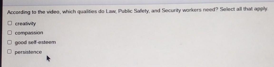According to the video, which qualities do Law, Public Safety, and Security workers need? Select all that apply