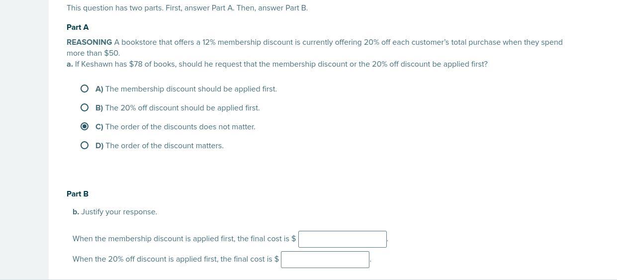 Part A: C) The order of discounts does not matter.