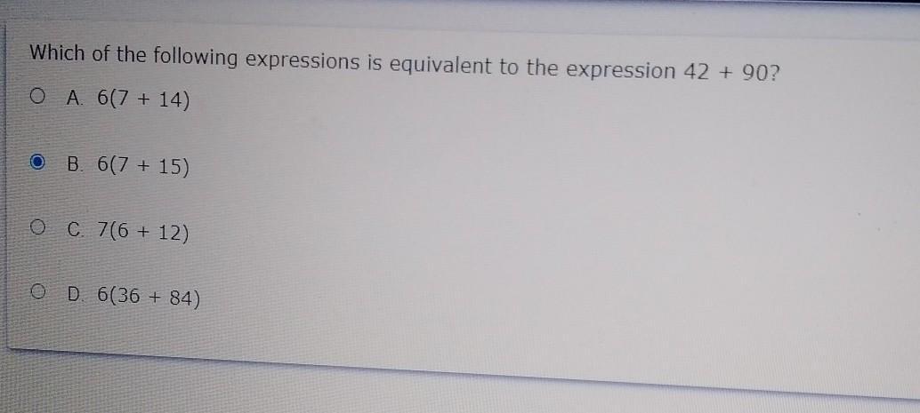 To do this, using 6(7+15), you multiply 6 by both the 7 and 15. So 6(7) + 6(15). Now you get 42+90. You can check each expression by doing this method to see if they equal 42+90.