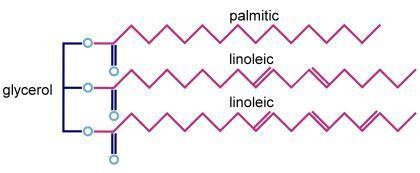 I have attached a picture containing triglyceride molecule (Same as described in question). When metabolism of this molecule occur it will be converted into 3 products (Picture of chemical reaction is attached). Triglyceride will release its backbone as glycerol molecule along with Linoleic acid and Palmitic acid. In this reaction 1 molecule of water will be utilized. Thus no molecule of water will be released.