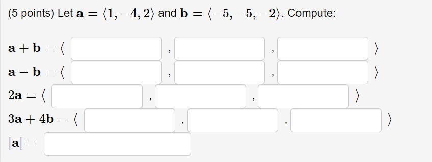 3a + 4b = ⟨3(1), 3(-4), 3(2)⟩ + ⟨4(-5), 4(-5), 4(-2)⟩ = ⟨3, -12, 6⟩ + ⟨-20, -20, -8⟩ = ⟨-17, -32, -2⟩