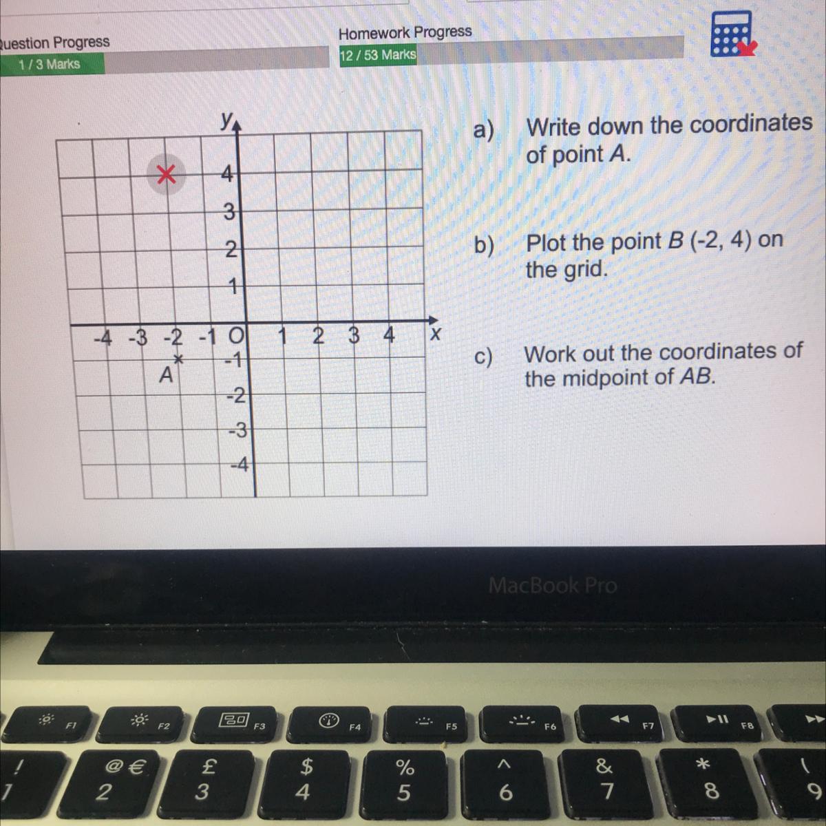 c) The coordinates of the midpoint of AB: