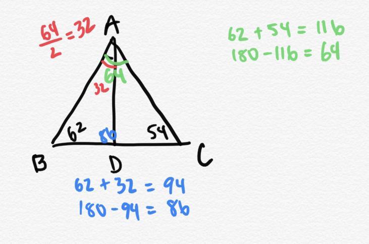 then subtract both 62 and 32 from 180 to get 86 degrees for angle ADB