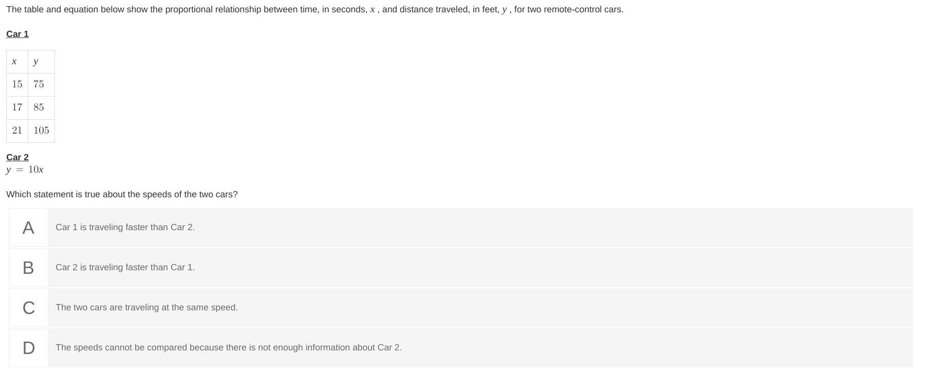 car 1 gradient = change in y / change in x =  \frac{85 - 75}{17 -15} = \frac{10}{2} = 5