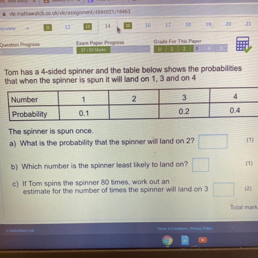 <em>P</em> = 5/8 - this is equal to the area under the graph over the interval [0, 5], which is the area of a rectangle with length 5 and height 1/8.